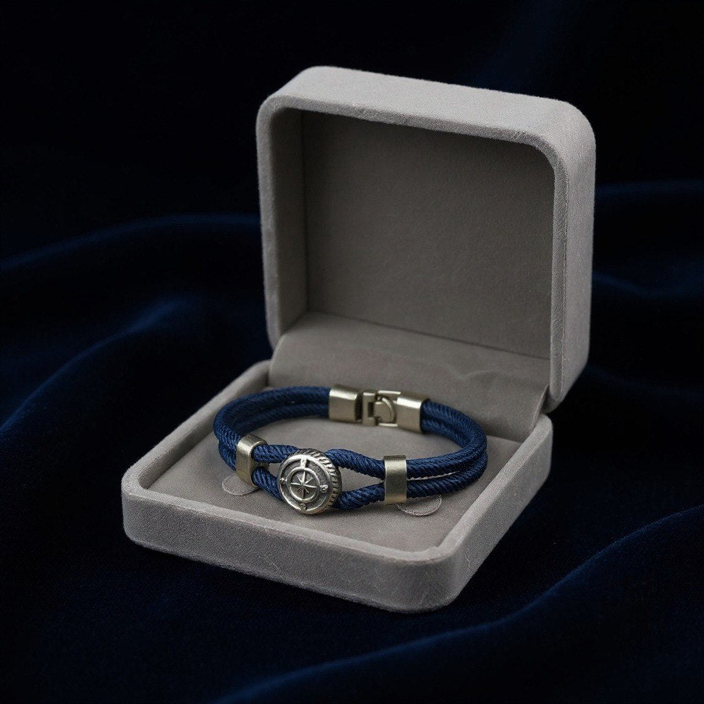 Crafted from durable navy cord and complemented with metal details featuring a compass emblem, it becomes your personal talisman both in travels and in everyday life.